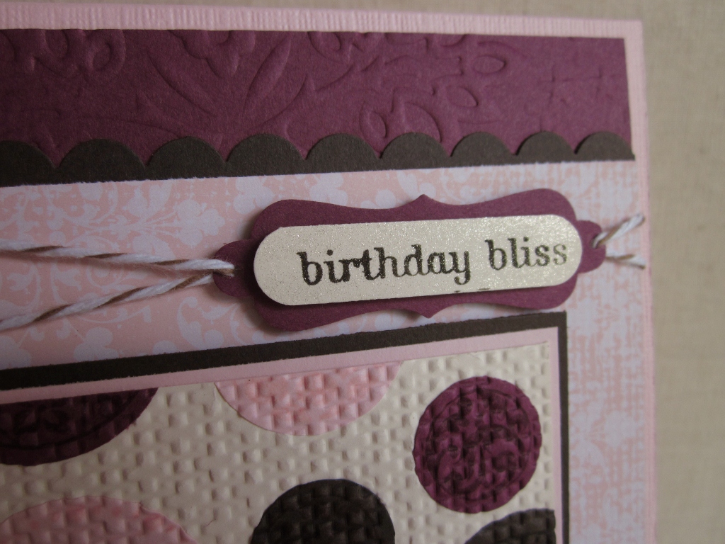 This card features polka dots which were stamped with Circle Circus and then embedded embossed through the square lattice embossing folder, then matted nicely. The focal flower was a bunch of bits of ribbon folded and glued to a circle base. The center sentiment was punched with the scallop circle, stamped with the hostess set Something to Celebrate. The ribbon colors are the same as the card stock, Pink Pirouette, Early Espresso, Rich Razzleberry, Victoria ribbon, very vanilla. The Pink Pirouette DSP was from a retired pack, and the Rich Razzleberry layer was embossed using the Backgrounds 1 texturz plate. The small flowers are from the itty bitty punch pack, and topped with basic pearls.